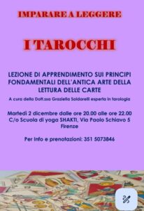 A tutti voi che avete desiderio di addentrarvi nel mondo della lettura delle carte ma anche a coloro che fossero mossi dalla semplice curiosità propongo per martedì 2 dicembre una lezione ricca di nozioni utili ad acquisirne familiarità e dimestichezza.
